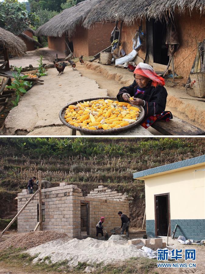 这是一张拼版照片。上图:12月3日,在云南省澜沧拉祜族自治县南岭乡勐炳村龙潭老寨,81岁的李娜六老人在老宅前剥玉米;下图:在云南省澜沧拉祜族自治县南岭乡勐炳村龙潭村民小组,李娜六老人的新宅正在建设中(12月3日摄)。 新华社记者杜涓涓摄