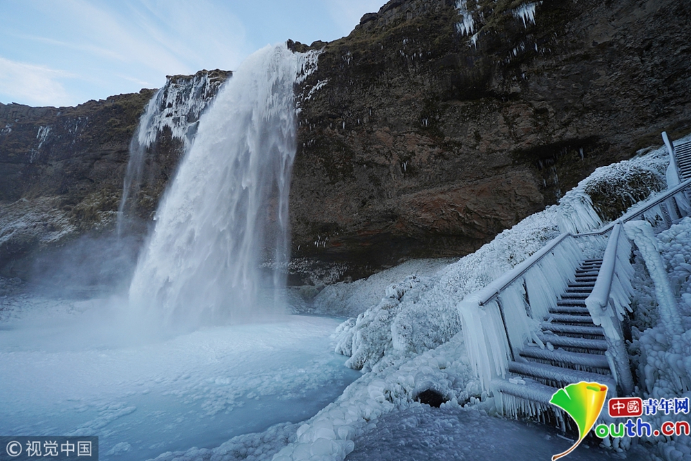 瀑布在零下12摄氏度的气温下结冰。图片来源:视觉中国