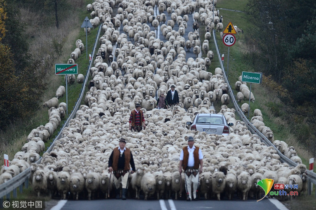 2018年9月27日讯(具体拍摄时间不详),波兰,浩浩荡荡的绵羊大军为了赶在冬天之前回到农场过冬,阻断了乡村的主车道。
