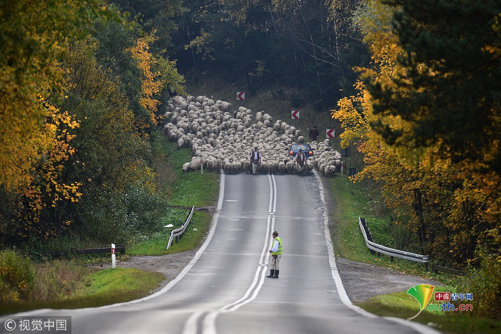 车辆不得不停下来,仿佛被无穷无尽的羊群吞没了,场面非常壮观。