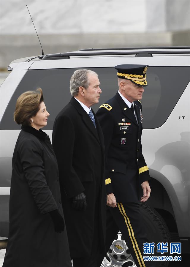 12月5日,在美国首都华盛顿,美国前总统乔治·沃克·布什(中)与夫人劳拉(左)抵达国会东广场。