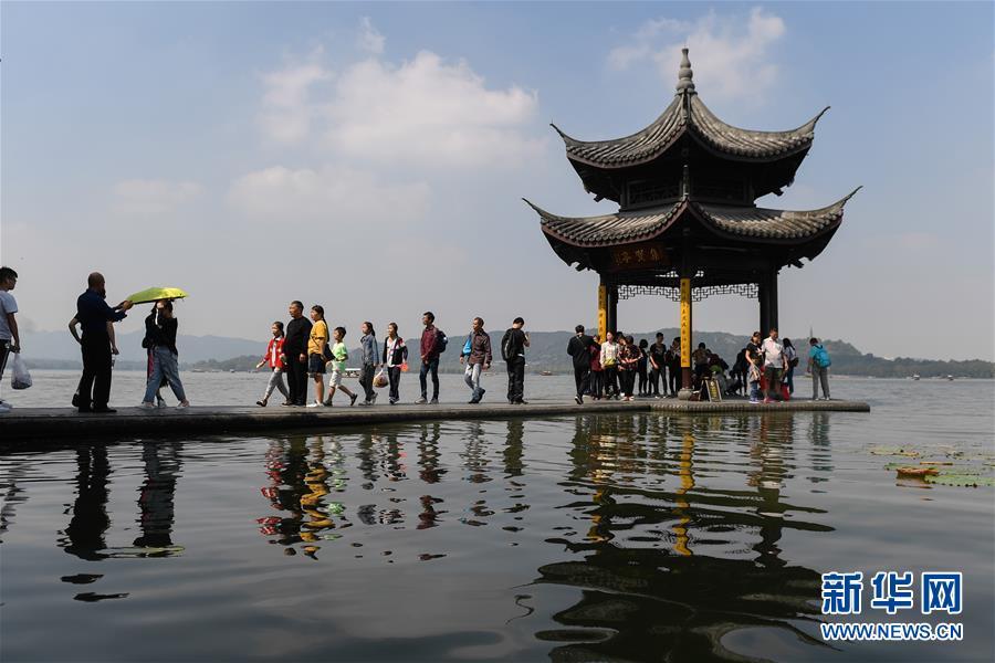 10月7日,游客在杭州西湖风景区集贤亭游览。当日是国庆黄金周最后一天,众多游客来到杭州西湖景区观光游览,热度不减。据杭州市旅游委员会公布的数据显示,从10月1日起截至10月7日12时,国庆七天杭州市各景区(点)接待游客总量达到1776.14万人次,其中西湖风景名胜区管委会所属公园景点共接待游客452.2万人次。新华社记者 黄宗治 摄
