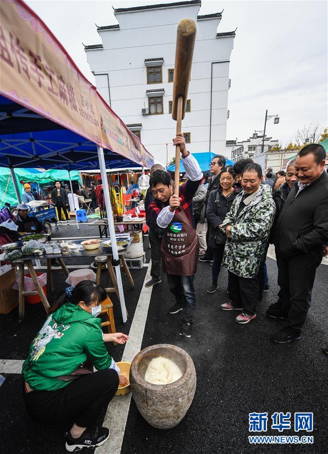 11月19日,商户在庙会现场展示传统打年糕。 新华社记者 徐昱 摄