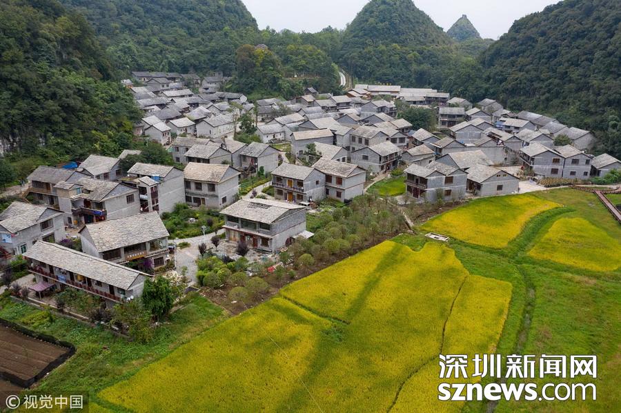 深圳新闻网讯  2018年9月27日,贵州安顺,航拍坐落在群山中的镇宁布依族苗族自治县高荡村。镇宁高荡村民居为石木结构干栏式石板房,建造时间五、六十年至数百年不等,建筑保存基本完好。