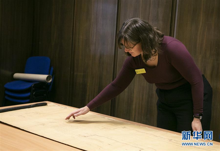 11月2日,在英国纽卡斯尔的泰恩—威尔档案馆,档案管理员瑞秋·吉尔介绍致远舰设计图纸。 新华社记者日前在纽卡斯尔泰恩—威尔档案馆查找北洋海军史料时发现一套七张、档案名为“中国巡洋舰舵机设计图”的原始图纸。尘封百年,甲午海战中抗击日舰后沉没的清北洋海军致远舰部分原厂设计图纸在其建造地——英国纽卡斯尔市的一家档案馆首次被发现,为打捞那段悲壮的历史提供了重要参考。 新华社记者 韩岩 摄