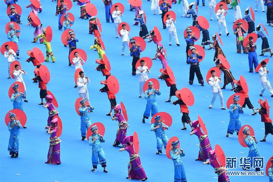 12月10日,广西壮族自治区成立60周年庆祝大会在广西体育中心隆重举行。这是庆祝大会上的群众文艺表演。 新华社记者 李鑫 摄