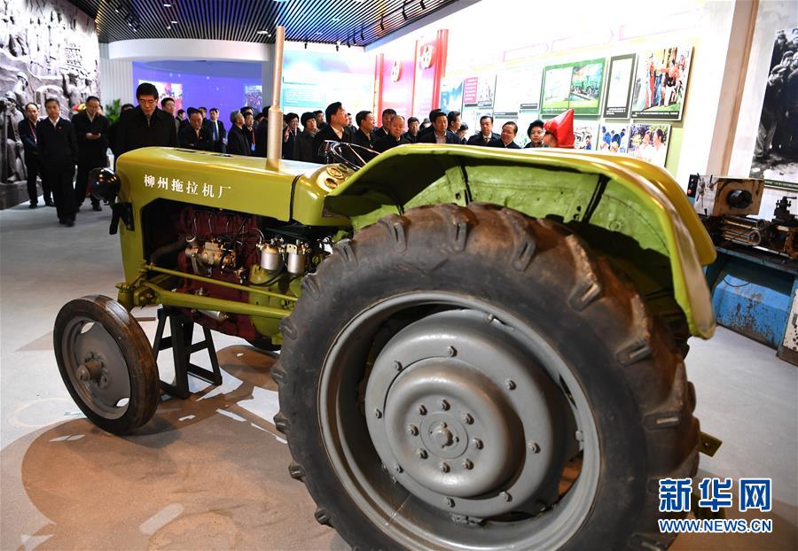 12月10日,观众在参观广西柳州20世纪60年代试制成功并生产的拖拉机。 当日,广西壮族自治区成立60周年大型成就展在位于南宁的广西规划馆开幕。 新华社记者 周华 摄