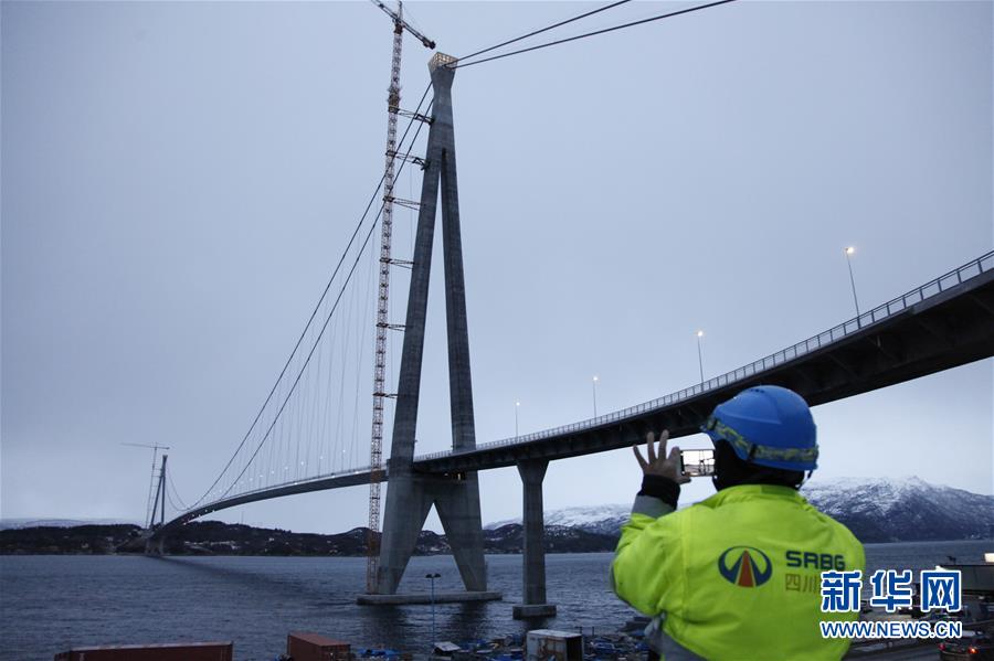 12月9日,一名中国工人拍摄挪威哈罗格兰德大桥。新华社记者梁有昶摄