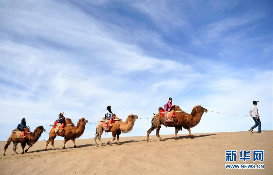 游客在敦煌鸣沙山骑骆驼(2017年5月3日摄)。 敦煌记录历史。开放的胸襟,曾让这里成为古代丝绸之路上“华戎所交一都会”。 时隔千年,改革开放的春风吹入西北内陆小城,敦煌再度成为中国对外开放的文化前沿。 新华社记者 陈斌 摄