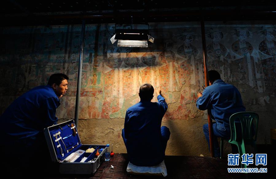 技术人员在莫高窟内对病害壁画进行修复(2014年9月3日摄)。 敦煌记录历史。开放的胸襟,曾让这里成为古代丝绸之路上“华戎所交一都会”。 时隔千年,改革开放的春风吹入西北内陆小城,敦煌再度成为中国对外开放的文化前沿。 新华社记者 陈斌 摄