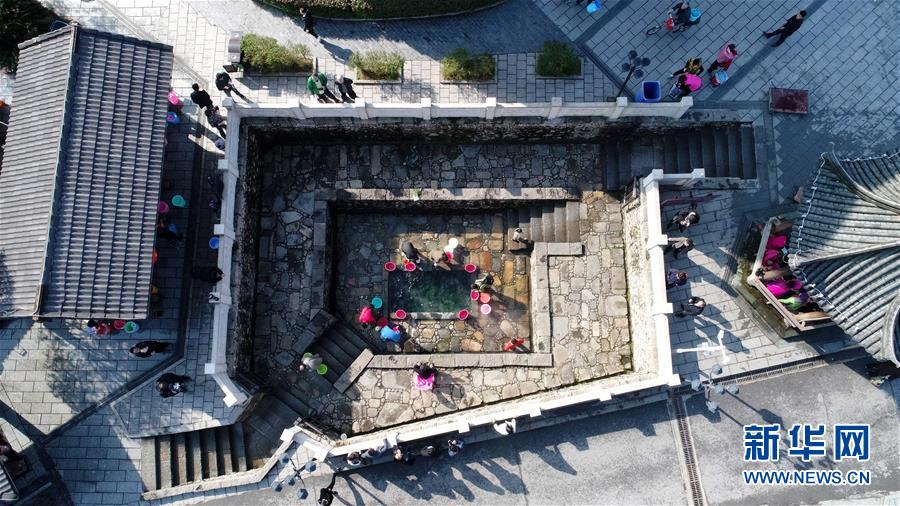 人们在江西宜春温汤镇的温泉泉眼边打水(2月28日无人机拍摄)。 新华社记者 彭昭之 摄