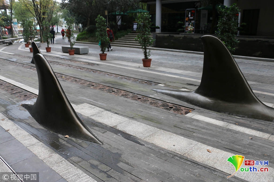 2018年11月20日,重庆一园区内马路中间突出一排“鲨鱼鳍”,司机路人都被“吓懵”了。突出的鲨鱼鳍将两侧的车行道分开,原来,这是为了进一步保证车流的有序进出和行人过街安全,同时也为了防止乱停车占用人行道,设置了这种异形“隔离桩”。图片来源:视觉中国