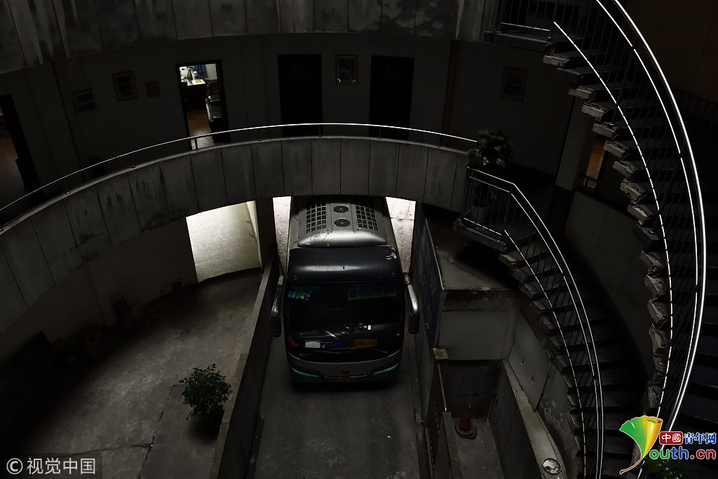 2018年12月6日,重庆江北红旗河沟汽车站内,有一栋独特的八层圆环状建筑,底层每天有不少进出站的客车通行。据悉,这栋楼建于1990年,曾经是车站旅馆,如今一、二两层用于车站办公,其余楼层已废弃。为确保安全,三层以上已经被封锁。图为公交车穿过8层空心圆筒楼。徐勇/视觉中国