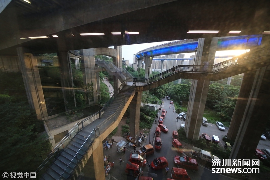 2018年5月29日,重庆,魔幻重庆又双叒叕放大招!还有一个独特的亮点,重庆轨道交通3号线铜元局站,出口由一段长梯衔接上方立交桥和下方的路面,与全国最高城市立交桥苏家坝立交组成了独特风景,许多游客专门赶来拍照。