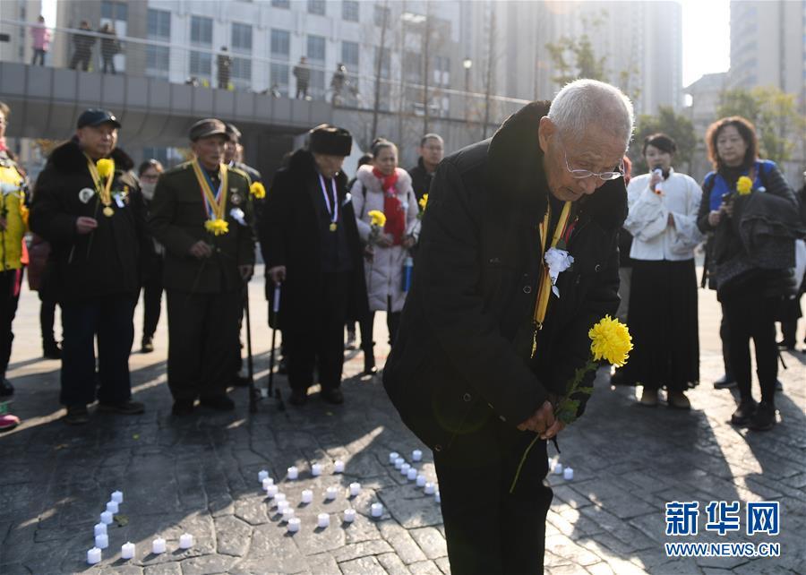 12月12日,来自湖南的抗战老兵李湘炳(前)等在侵华日军南京大屠杀中山码头遇难同胞纪念碑前祭奠遇难同胞。 当日,来自湖南、江苏等地的4名抗战老兵以及志愿者、南京当地大学生代表等来到侵华日军南京大屠杀中山码头遇难同胞纪念碑前献花、默哀,祭奠遇难同胞。 新华社记者 季春鹏 摄