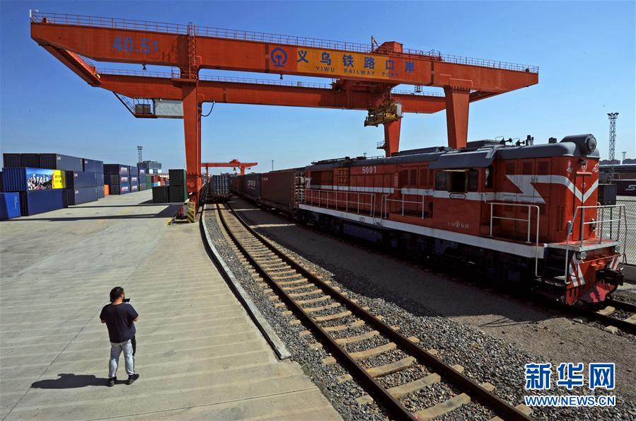 在浙江义乌铁路西站,一列驶往西班牙马德里的中欧班列(义乌)缓缓发车(10月27日摄)。 新华社记者 谭进 摄