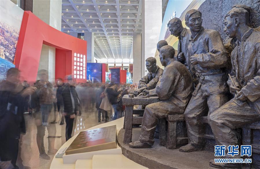 11月18日,观众在观看安徽小岗村农民按下包产到户“红手印”的雕塑(慢门拍摄)。新华社记者 才扬 摄