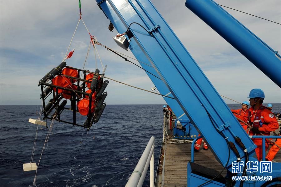 考察队员将负责拍摄和诱捕生物的“彩虹鱼”第二代着陆器布放到海里(12月10日摄)。 由上海海洋大学和西湖大学联合组成的“彩虹鱼”科考团队,12月11日在全球最深的海沟——马里亚纳海沟成功完成两台“彩虹鱼”第二代着陆器的万米级海试,深度分别为10918米和10899米。 新华社记者 张建松 摄