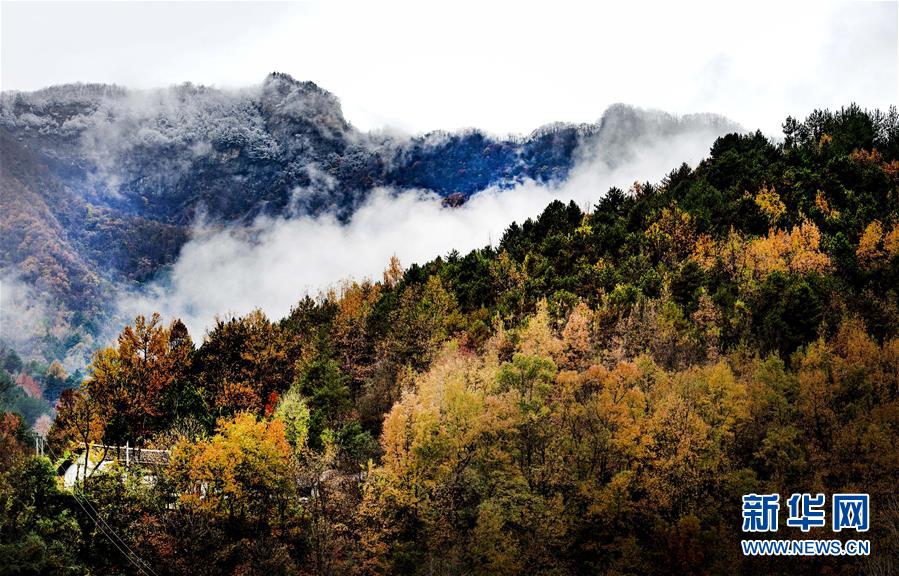 11月5日无人机拍摄的陕西省汉中市佛坪县城旁的秦岭景色。  新华社记者陶明摄