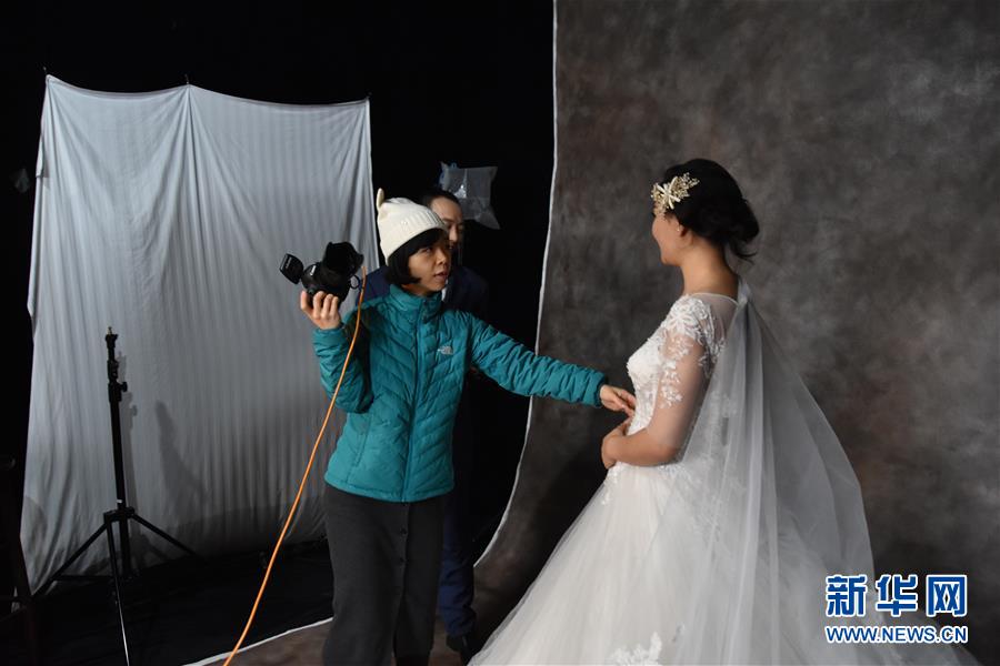摄影师罗娴为农民工夫妻拍摄婚纱照(12月10日摄)。