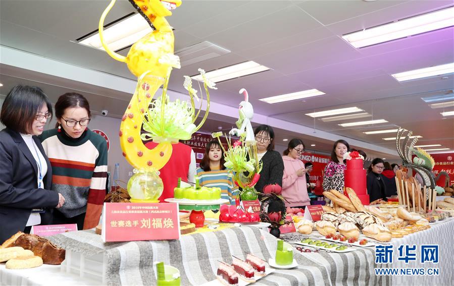 12月13日,参观者在烘焙和糖艺成品展示现场参观。 当日,2018年中国技能大赛——上海市食品行业职业技能竞赛(西式面点师项目)在上海环球港举行。活动分为竞赛和展示两部分,近400名选手参加竞赛部分比拼,最终进入决赛的25名选手的作品在现场进行展示评比。 新华社记者 方喆 摄