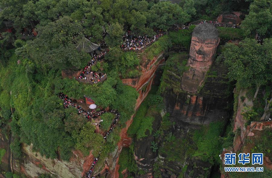 10月4日,游客在乐山大佛前排队一睹大佛真容(无人机拍摄)。 新华社记者 江宏景 摄