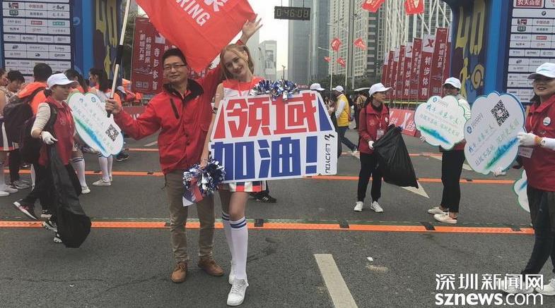 终点处有志愿者与啦啦队支持者合影留念。