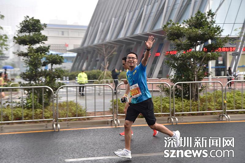 2018年12月16日讯(记者杨浩瀚)2018年12月16日,深圳国际马拉松位于后海的折返点,一名选手向镜头招手。
