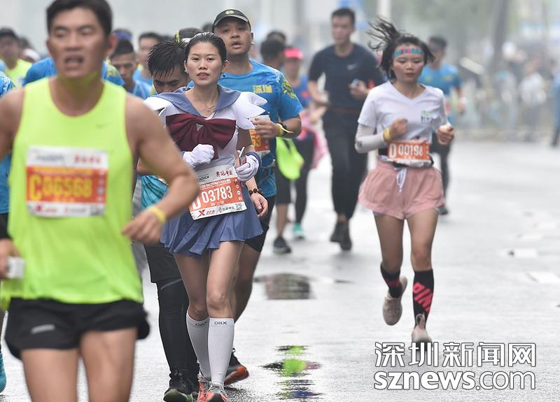 2018年12月16日,深圳国际马拉松位于后海的折返点,一名身着女仆装的选手正在向终点冲刺。