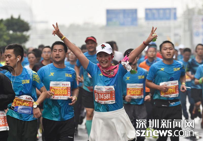 2018年12月16日,深圳国际马拉松位于后海的折返点,即将抵达终点,一名选手欢呼雀跃。