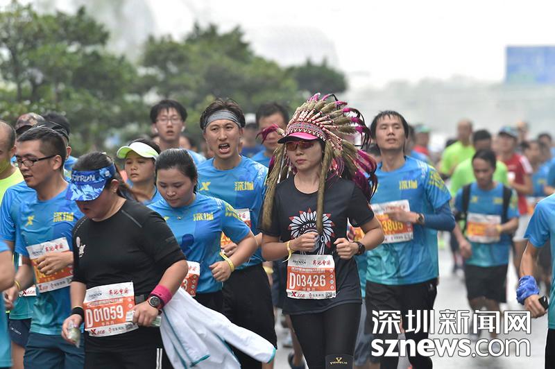 2018年12月16日,深圳国际马拉松位于后海的折返点,一名选手头戴特色头饰,向终点冲刺。