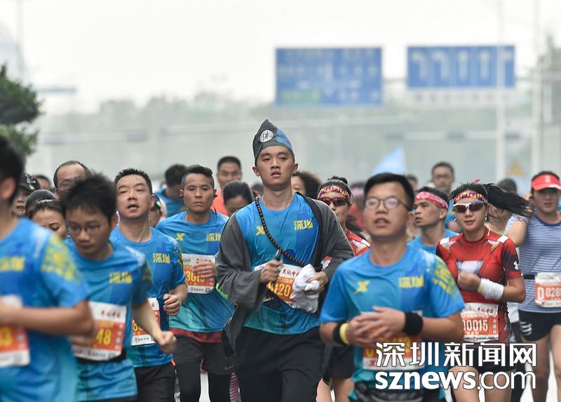2018年12月16日,深圳国际马拉松位于后海的折返点,一名穿着济公服装的选手正在向终点冲刺。