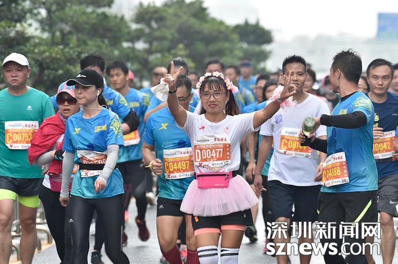2018年12月16日,深圳国际马拉松位于后海的折返点,一名选手正在向终点冲刺,并向镜头招手。