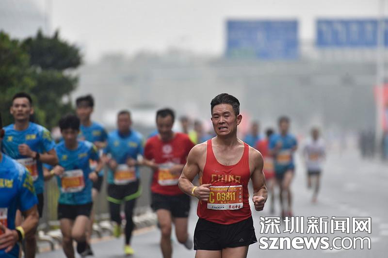 2018年12月16日,深圳国际马拉松位于后海的折返点,一名身着中国字样背心的选手正向终点冲刺。