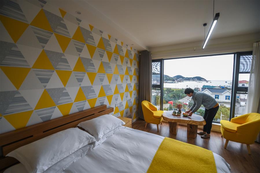 12月15日,工作人员在朱家尖乌石塘“渔夫客栈”民宿客房内忙碌。 新华社记者 徐昱 摄