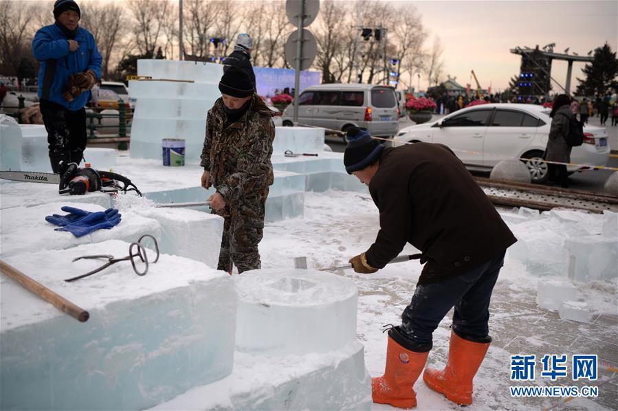 12月17日,冰雕师在松花江畔制作冰雕景观。