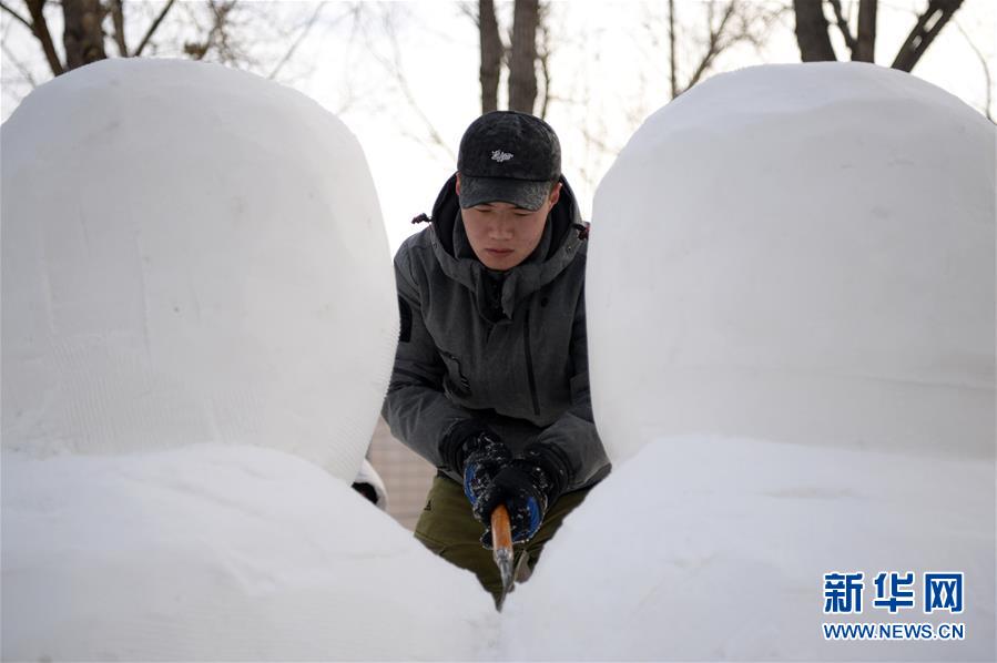 12月17日,雪雕师在松花江畔制作雪雕景观。新华社记者王凯摄