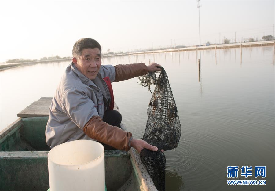 12月17日,在湖州市吴兴区高新区庙港人千亩水产园,蟹农在捕收大闸蟹。 新华社记者翁忻旸摄