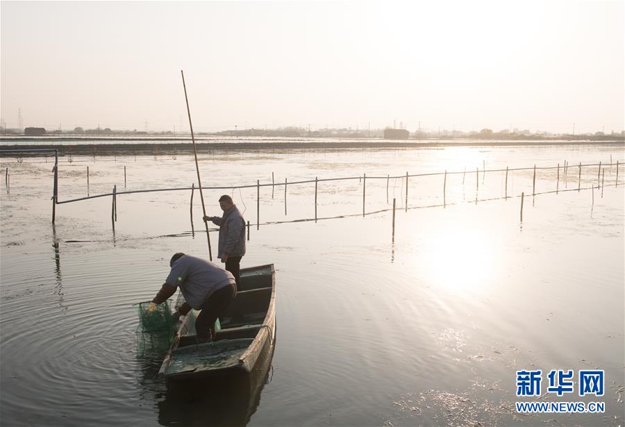 12月17日,在湖州市吴兴区高新区庙港人千亩水产园,蟹农在捕收大闸蟹。 新华社记者翁忻旸摄