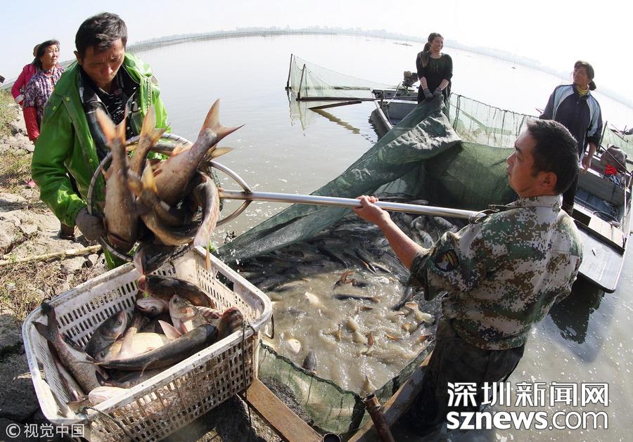 深圳新闻网讯  江苏扬州,邗江区公道镇南湖村南湖水域,专业捕捞队人员已集结到胡登强养殖户家鱼塘进行捕捞作业。据捕捞队员沈昌田介绍,近期随气温转冷,鱼的销量增加,水产养殖户纷纷捕鱼上市,为赶在上午10时将鱼运到水产批发市场销售,专业捕捞队员们天不亮就起床,下河塘布围网、收网捞鱼、过秤装车。一周捕捞作业有三四次之多,一次捕捞多达上万斤鱼。公道镇有水面滩涂6.5万亩,是鱼、虾、蟹、等水产品养殖的理想场所。