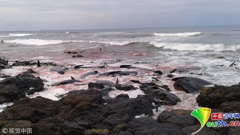 多头巨鲸新西兰海岸搁浅死亡 沿海海水染成红色