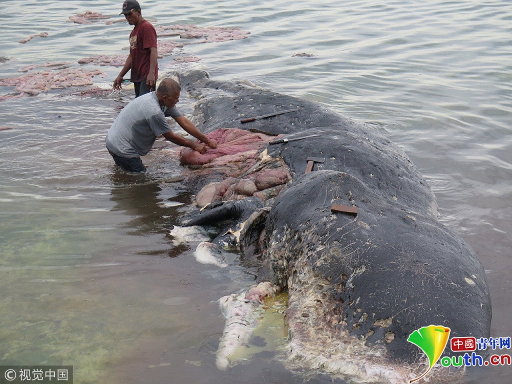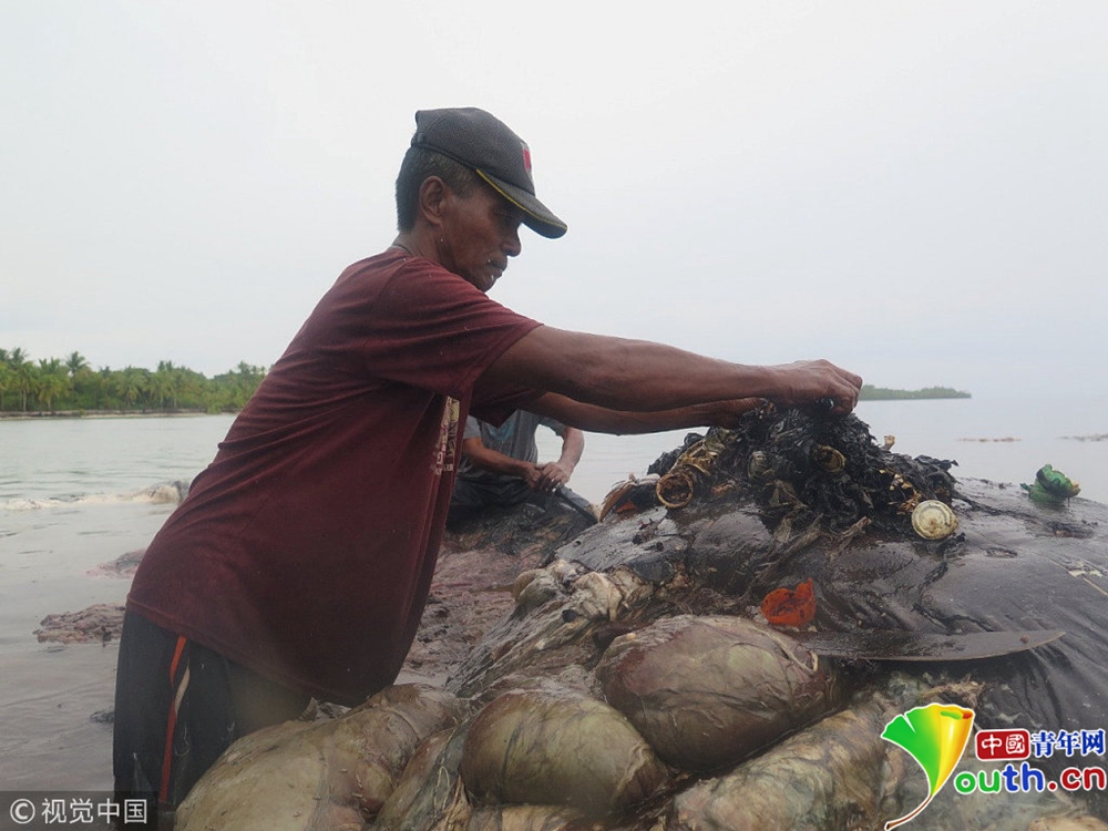 鲸鱼搁浅印尼海岸 肚子里满是塑料垃圾