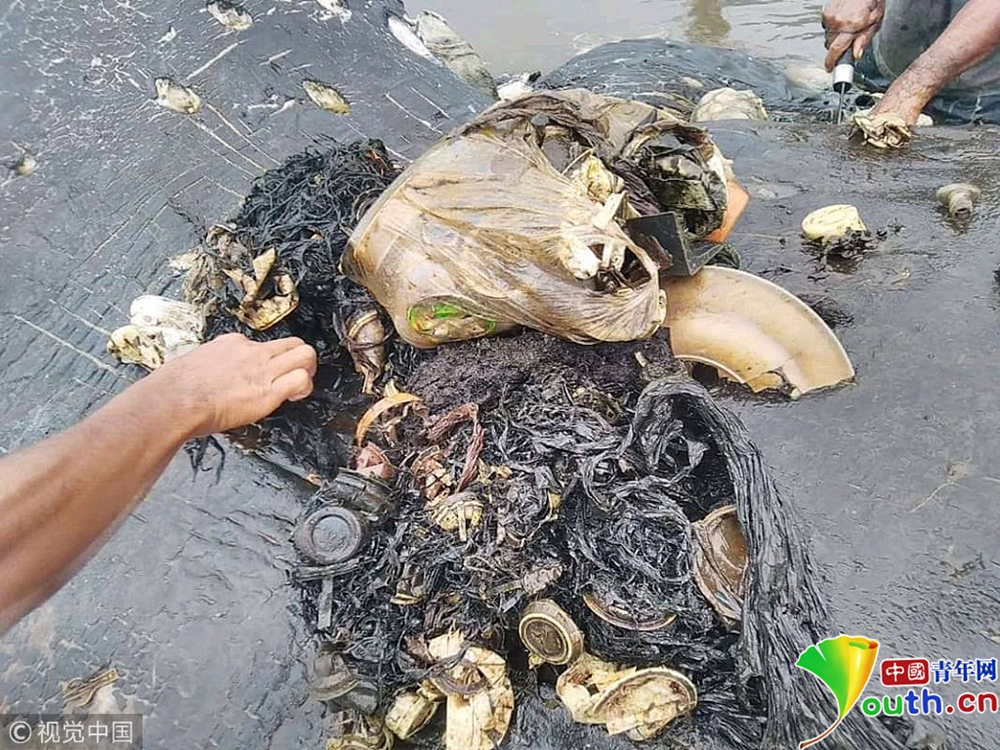 当地时间2018年11月19日,印尼瓦卡托比,当地发现一头搁浅的鲸,肚子里满是塑料垃圾。它的腹中有12斤塑料垃圾,其中包括115个杯子。