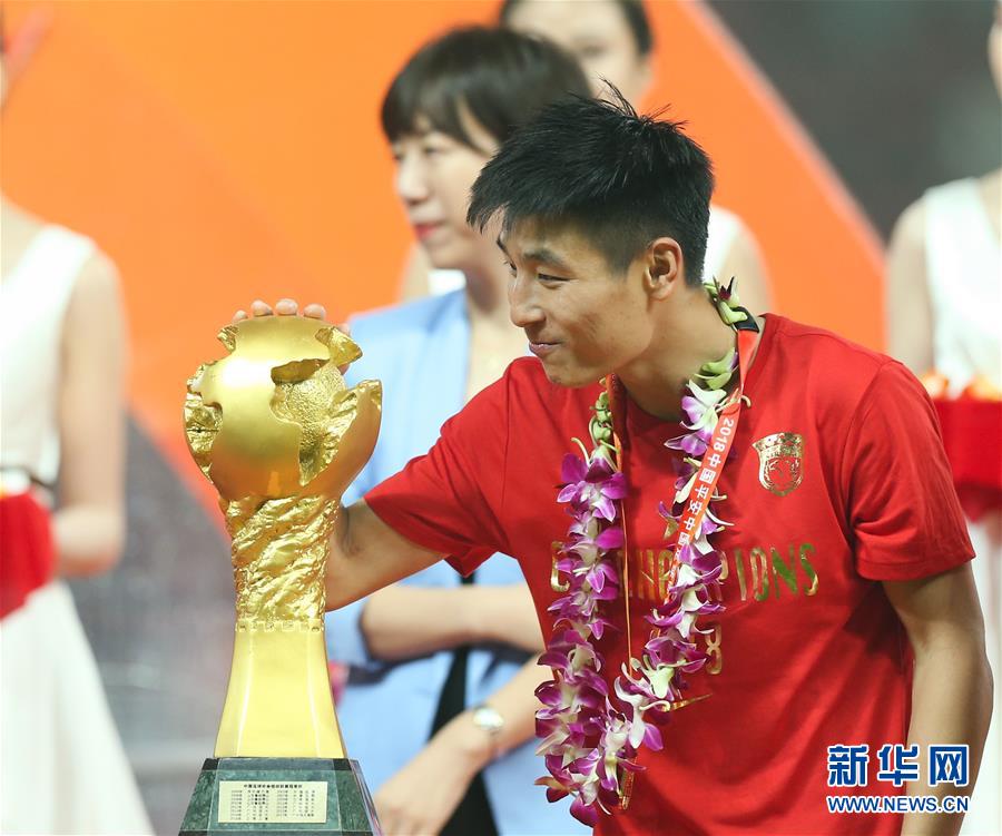 图为2018年11月7日,上海上港队球员武磊在球队提前一轮夺得2018年中超联赛冠军后抚摸火神杯的资料照片。 新华社记者丁汀摄