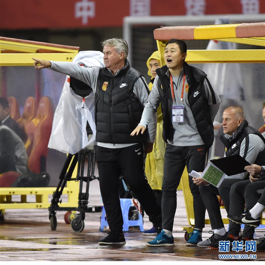 图为2018年11月15日,中国U21男子足球队主教练希丁克(左一)和中方教练组长孙继海(左二)在与泰国U21男子足球队的2018年中国足协中国之队国际青年足球锦标赛中的资料照片。 新华社记者唐奕摄