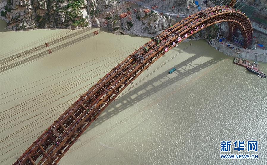 9月28日拍摄的川藏铁路拉林段重点标志性工程藏木特大桥。 当日,随着最后一节钢管拱的对位和锁定完毕,川藏铁路拉林段藏木特大桥成功合龙,标志着大桥主体结构施工取得了关键性胜利。藏木特大桥由中国中铁广州局集团承建,拱高112米,桥横跨雅鲁藏布江峡谷,水深66米。 新华社记者普布扎西摄