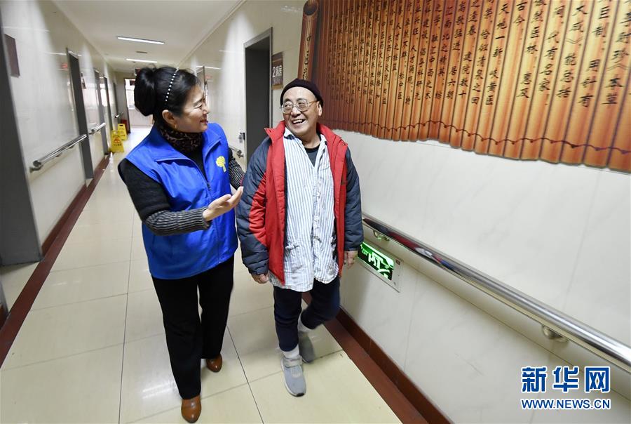12月17日,丰台区长辛店街道车辆厂社区养老服务驿站的员工陪同她们通过“连心通”救助的突发疾病独居老人连铁良(右)做康复。 新华社记者 李欣 摄