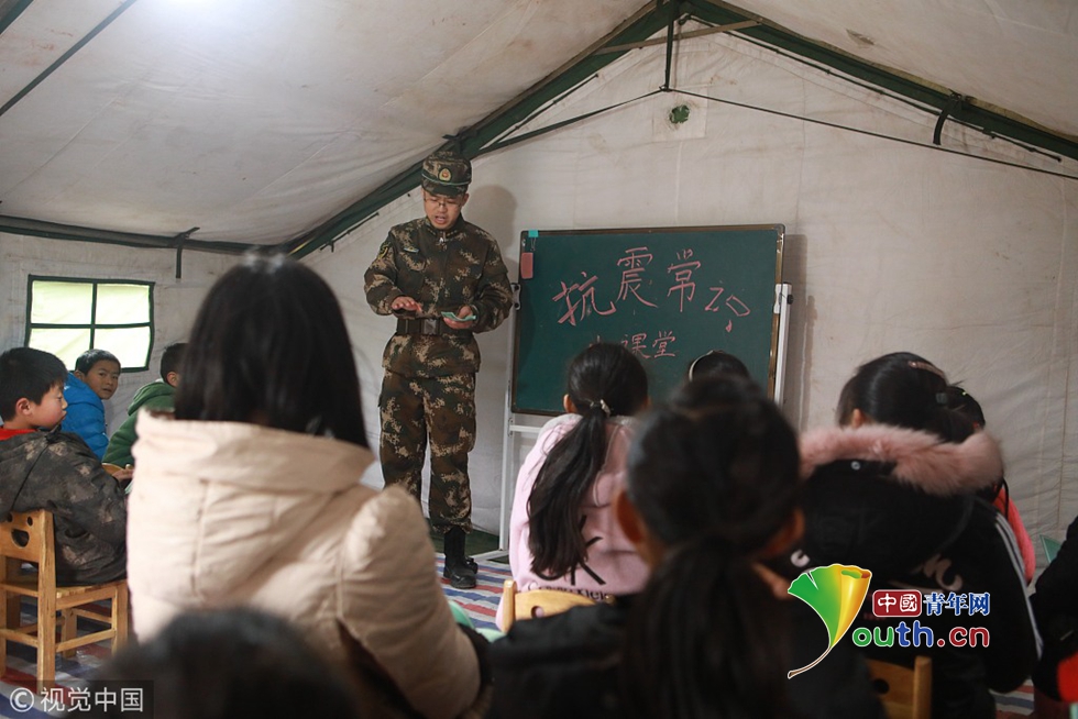 2018年12月18日,四川宜宾。武警宜宾支队政治工作处宣传保卫股股长朵祝伟为周家镇新塘安置点的“帐篷学校”的学生上抗震常识课。图片作者:谢江、刘崇达/视觉中国