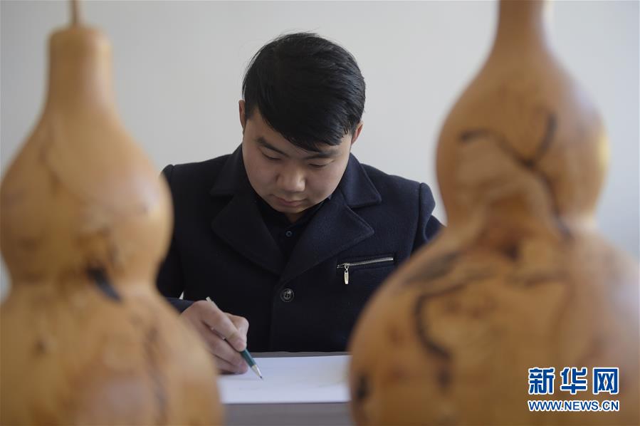 12月18日,刘征在自己的加工坊里设计葫芦衍生品的草图。 新华社记者 鲁鹏 摄