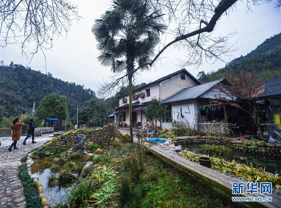 12月19日,客人走进民宿“僻地寒楼”。该民宿共有7幢风格各异的小屋分布在山坡上,颇具特色。河桥镇青年张雁辞去了上海的工作,回到家乡开办了这家民宿。 新华社记者 徐昱 摄